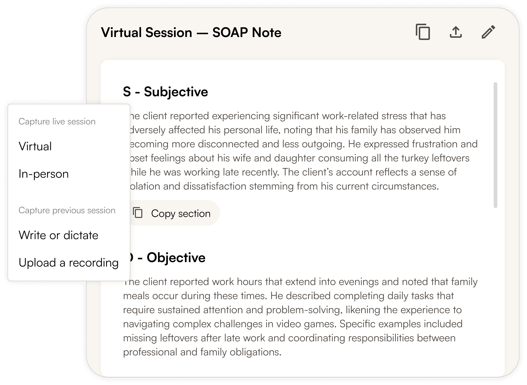 Smart TemplatesSOAP, DAP, BIRP and other industry-standard templates are auto-filled and export-ready in under a minute.